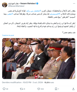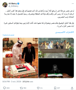 عبر نشطاء وصحفيين عن أسفهم وغضبهم بعد حفل ضخم أقامته مصر، يرعاه الرئيس المصري عبد الفتاح السيسي، على شرف محمد بن زايد آل نهيان رئيس دولة الإمارات العربية المتحدة.