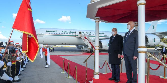 وقد استمع الرئيسان الى النشيدين الوطنيين للبلدين قبل أن يستعرضا تشكيلة من افراد الجيش كانت تؤدي لهما التحية الشرفية، وهذا على وقع دوي 21 طلقة مدفعية ترحيبا بالرئيس تبون قبل ان يرافق الرئيس التونسي ضيفه الجزائري الى مقر إقامته.