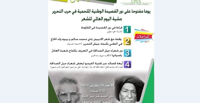وأشار الأمين العام للاتحاد، نفعي أحمد محمود، في اتصال أجراه معه موقع الصحراوي، إلى أن اتحاد الصحفيين والكتاب والأدباء الصحراويين، سينظم “بالتعاون مع وزارة الثقافة بوما مفتوحا على القصيدة الملحمية الوطنية ودورها في الكفاح الوطني العادل عبر مداخلات شعرية ومحاضرات يوم الأحد 20 مارس بمقر الإتحاد بالشهيد الحافظ على الساعة العاشرة صباحا”.
