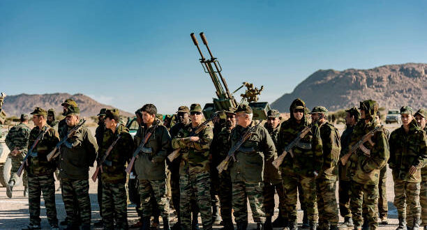MEHAIRES, WESTERN SAHARA - JANUARY 06: Military units of the army of the Arab Democratic Republic Saharawi waiting for the beginning of the the manoeuvres in the fourth military region in the north-east of Western Sahara on January 6, 2019 in Mehaires, Western Sahara. The manoeuvres, under the name of Shahid Uali involve around 3,000 soldiers and a dozen armoured vehicles, and are designed to protect the region and maintain stability in the freed Saharawi territories. Morocco considers these military manoeuvres as a "threat" to the ceasefire in force between the parties since 1991. (Photo by Stefano Montesi - Corbis/Corbis via Getty Images)