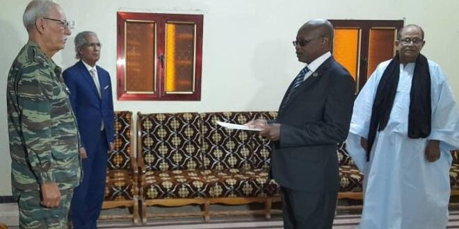 مراسيم تقديم أوراق الإعتماد جرت بمقر الرئاسة الصحراوية ، وفق البروتوكول المعمول به ، بحضور وزير الشؤون الخارجية السيد محمد سالم ولد السالك .