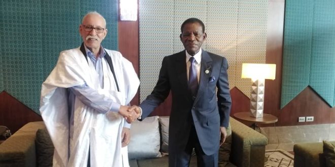 إستقبل يوم السبت، رئيس دولة غينيا الإستوائية السيد تيودورو أوبيانغ أنغويما، رئيس الجمهورية الصحراوية والأمين العام لجبهة البوليساريو السيد إبراهيم غالي، وذلك على هامش أشغال القمة الإستثنائية للإتحاد الإفريقي حول القضايا الإنسانية والإرهاب ومؤتمر إعلان التبرعات المنظم بالعاصمة مالابو.