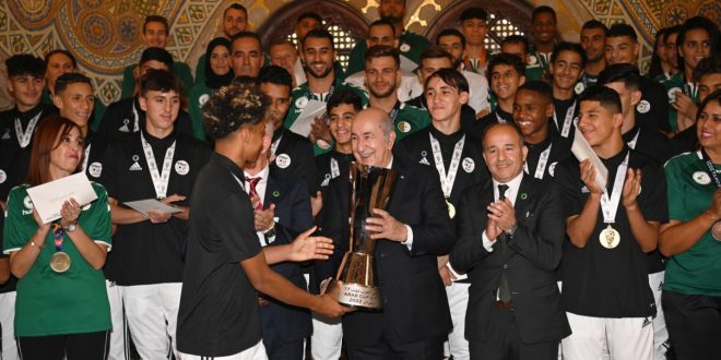 كرم رئيس الجمهورية, السيد عبد المجيد تبون, اليوم الاربعاء بقصر الشعب (الجزائر), عناصر المنتخب الوطني للناشئين لكرة القدم, وكذا الرياضيين المتألقين في العاب التضامن الإسلامي بقونيا (تركيا) ورياضيين من ذوي الهمم وعدد من المتوجين في مختلف الفعاليات الرياضية الإقليمية والدولية.