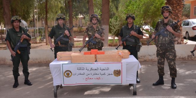 وفي إطار محاربة الجريمة المنظمة ومواصلة للجهود الحثيثة الهادفة إلى التصدي لآفة الاتجار بالمخدرات ببلادنا، أوقفت مفارز مشتركة للجيش الوطني الشعبي، بالتنسيق مع مختلف مصالح الأمن خلال عمليات مختلفة عبر النواحي العسكرية، (65) تاجر مخدرات وأحبطت محاولات إدخال كميات كبيرة من المخدرات عبر الحدود مع المغرب، تُقدر بـ (08) قناطير و(76) كيلوغرام من الكيف المعالج، فيما تم ضبط (475772) قرصا مهلوسا.