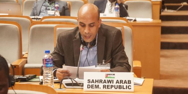 وخلال التطرق إلى أوضاع حقوق الإنسان بالأراضي المحتلة من الجمهورية الصحراوية، أطلع ممثل الدولة الصحراوية الحضور على الانتهاكات الصارخة للقانون الدولي لحقوق الإنسان والقانون الدولي الإنساني التي تحدث يوميا هناك، والموثقة في عديد تقارير المنظمات الدولية المختلفة، مشدداً على أن حماية المدنيين وحقوق الإنسان مطلب دولي وقاري لا يجب أن يشهد أي تمييز أو كيل بمكيالين بين ما يقع في الصحراء الغربية وما يقع في أماكن أخرى من القارة، منبهًا إلى أن أي توجه جاد لمعالجة موضوع حقوق الإنسان بالقارة لابد أن يحيط بجميع النقاط السوداء لانتهاكات حقوق الإنسان وأن يبحث في كيفية معالجتها والتقرير عنها، ومن هذا المنطلق، طالب باسم الجمهورية الصحراوية من اللجنة أن تعمل مع الجهات الفاعلة الأخرى على الوقف الفوري للانتهاكات الجسيمة والممنهجة المرتكبة من قبل الأجهزة الأمنية المغربية، والموجهة ضد المدنيين الصحراويين والمدافعين عن حقوق الإنسان بعيدا عن المراقبة الدولية بسبب استمرار الحصار العسكري والتعتيم الإعلامي المفروض على الصحراء الغربية المحتلة، وأن يتم العمل على إطلاق سراح جميع المعتقلين السياسيين الصحراويين القابعين بالسجون المغربية، والكشف عن مصير المفقودين، ووقف عمليات النهب المكثف لثروات الصحراويين وإزالة الجدار العسكري المغربي الذي يقسم الصحراء الغربية، أرضاً وشعباً.