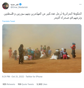 تداولت عدة مواقع اعلامية، صفحات وحسابات على مواقع التواصل الاجتماعي فيسبوك وتويتر، مؤخرًا، صورة لعدد كبير من المهاجرين بينهم سوريون وفلسطينيون، أطفال ونساء، زعمت ان السلطات الجزائرية قامت بترحيلهم إلى صحراء النيجر، بالتزامن مع احتضانها للقمة العربية.
