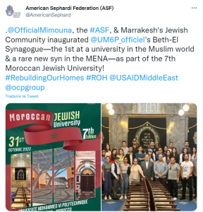 أعلنت جمعية ميمونة الناشطة في مجال إحياء التراث الثقافي اليهودي بالمغرب، الأربعاء، عن افتتاح كنيس يهودي في حرم جامعة محمد السادس “بوليتيكنيك”، بمراكش، في سابقة هي الأولى من نوعها في البلاد.