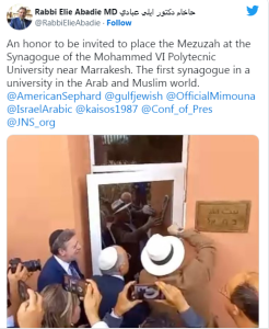حضر حفل افتتاح هذا الكنيس اليهودي بالجامعة المغربية،الحاخام إيلي أبادي، كبير الحاخامات في المجلس اليهودي لدولة الإمارات، وعبّر  في تغريدة عن “الشرف الكبير الذي حظي به بمشاركته في افتتاح الكنيس”.