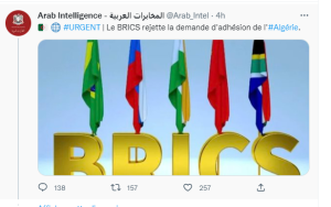 قول أن دول بريكس رفضت طلب انضمام الجزائر، ليس سوى ضرب من النّهيق! الحديث عن الرفض أو القبول سابق لأوانه، لأن قمة دول مجموعة بريكس ستعقد اجتماعها المقبل عام 2023 في جنوب أفريقيا، والجزائر ليست الدولة الوحيدة طالبة الانضمام لهذا التكتل، بل هناك السعودية والأرجنتين ومصر وربما دول أخرى.