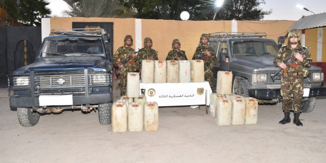 وفي سياق متصل، أحبط حراس الحدود بالتنسيق مع مصالح الدرك الوطني محاولات تهريب كميات كبيرة من الوقود تُقدر بـ (27076) لتر بكل من تبسة وسوق أهراس والطارف وتمنراست،