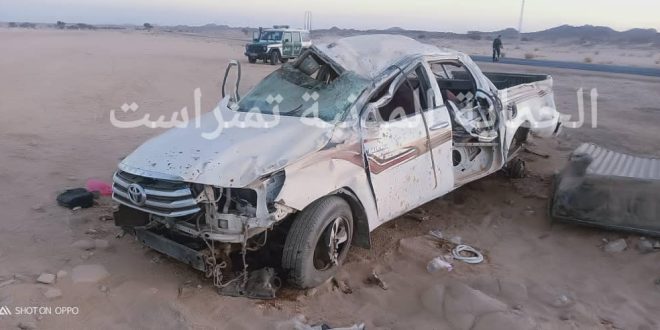 ووقع الحادث على الساعة 10 و04 د صباحا بالطريق الوةطني رقم 01 على بعد 35 كلم بإتجاه تمنراست حيث تمثل في انحراف وانقلاب سيارة رباعية الدفع من نوع تويوتا هيلكس على متنها 19 شخصا حيث أسفر عن هلاك شخصين وإصابة 17 آخرين.