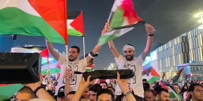 ورفعوا في وجوههم الأعلام الفلسطينية، وزينت معاصمهم الرموز الوطنية واعتمروا الكوفية الفلسطينية، وغصت شوارع الدوحة بالصور والشعارات الوطنية الفلسطينية، واستغل الفلسطينيون والمتضامنون معهم السياسة القطرية التي سمحت للمشاركين والحضور بالتعبير عن وجهات نظرهم، بما لا يخل بالعقيدة الإسلامية والأخلاق العامة، فبثوا الأناشد والأهازيج الفلسطينية، ونشروا عبر وسائل التواصل الاجتماعي مقاطع فنية وأخرى سياسية، تعبر كلها عن العنصرية العدوانية الصهيونية، وتوضح المظلومية والمعاناة الفلسطينية.
