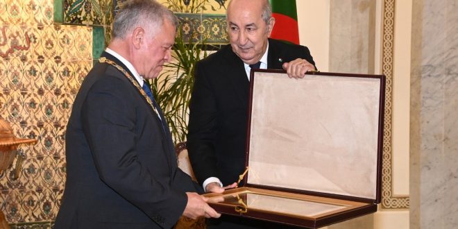 قلد رئيس الجمهورية السيد عبد المجيد تبون، ملك الأردن، عبد الله الثاني بن الحسين، سهرة أمس السبت بالجزائر العاصمة، وسام أثير من مصف الاستحقاق للجمهورية الجزائرية الديمقراطية الشعبية، حسب بيان لرئاسة الجمهورية.