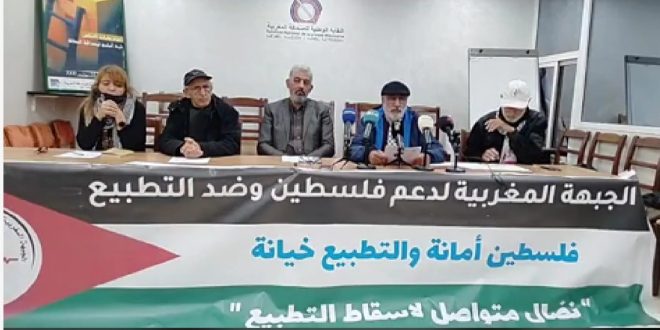 طالبت الجبهة المغربية لدعم فلسطين وضد التطبيع, اليوم السبت, بالإلغاء النهائي لاتفاق التطبيع الذي أبرمه المخزن مع الكيان الصهيوني المحتل, لأنه غير شرعي وضد ارادة الشعب المغربي, مؤكدة استمرارها في النضال حتى اسقاط اتفاقيات “الخزي و العار”.