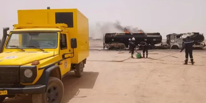 تدخلت عناصر الوحدة الثانوية للحماية المدنية تين زواتين، اليوم السبت، على الساعة 11 و35 د لأجل إخماد حريق شاحنتين ذات صهريج، الأولى محملة بمادة البنزين والثانية محملة بمادة المازوت، تابعتين للقافلة الممونة للمحروقات في منطقة عين زازن على بعد حوالي 03 كم من بلدية ودائرة تين زواتين، من دون تسجيل أي خسائر بشرية.