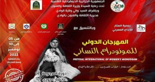 برمجت عشرة (10) عروض مسرحية في المهرجان الدولي للمونودراما النسائي في طبعته الثانية الذي انطلقت فعالياته مساء امس السبت بالوادي. وتشارك في هذه التظاهرة الثقافية الى جانب الجزائر فرق من فلسطين ومصر وتونس ومصر و ليبيا و بلجيكا و فرنسا اضافة الى فرقة من الاردن كضيف الشرف،. وشهد حفل الافتتاح عرض مونودراما “كميشة” من إنتاج تعاونية فنون وثقافة (سطيف) مستوحى …