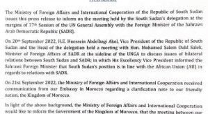 أصدرت وزارة العلاقات الخارجية لجمهورية جنوب السودان، بيانا اليوم الخميس، ردا على محاولات من المملكة المغربية لثنيها عن إعادة استئناف العلاقات مع الجمهورية الصحراوية، على خلفية إعلانها مؤخرا استئناف هذه العلاقات بعد لقاء أجراه نائب رئيسها، السيد حسين عبد الباقي أكول، مع وزير الخارجية الصحراوي يوم الثلاثاء على هامش اشغال الدورة العادية 77 للجمعية العامة للأمم المتحدة. واوضح البيان أن …