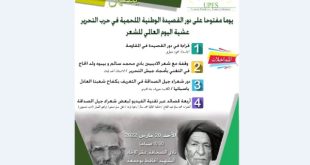 أعلن اتحاد الصحفيين والكتاب الصحراويين يوم الجمعة عن تنظيمه يوما دراسيا حول دور القصيدة الوطنية الملحمية في حرب التحرير، بالتوازي مع تخليد اليوم العالمي للشعر الموافق ليوم 21 مارس من كل سنة. وأشار الأمين العام للاتحاد، نفعي أحمد محمود، في اتصال أجراه معه موقع الصحراوي، إلى أن اتحاد الصحفيين والكتاب والأدباء الصحراويين، سينظم “بالتعاون مع وزارة الثقافة بوما مفتوحا على …