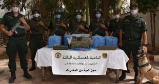 أوقفت مفارز مشتركة للجيش الوطني الشعبي، بالتنسيق مع مختلف مصالح الأمن، بإقليمي الناحيتين العسكريتين الثانية والثالثة (05) تجار مخدرات وضبطت (11) قنطار و(51) كيلوغرام من الكيف المعالج حاولت المجموعات الإجرامية إدخالها عبر الحدود مع المغرب، في حين تم توقيف (26) تاجر مخدرات آخرين وحجز (120)كيلوغرام من نفس المادة بالإضافة إلى (54989) قرصا مهلوسا خلال عمليات مختلفة عبر نواحي عسكرية أخرى